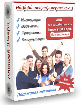 ОПИСАНИЕ: Авторский курс Алексея Шварца “ИНФОБИЗНЕС ПО АМЕРИКАНСКИ, или КАК ЗАРАБАТЫВАТЬ БОЛЕЕ $100 В ДЕНЬ БЕЗ ВЛОЖЕНИЙ”, в котором, основываясь на современных американских методиках, раскрыты все секреты быстрого создания сверхприбыльного инфобизнеса без начальных инвестиций.